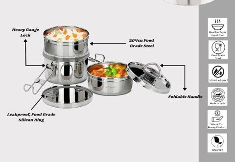 - 𝐋𝐞𝐚𝐤-𝐩𝐫𝐨𝐨𝐟 𝐂𝐨𝐧𝐬𝐭𝐫𝐮𝐜𝐭𝐢𝐨𝐧: Falcon Royal Lily Stainless Steel Leak Proof Tiffin with 2 - Separate Containers 700 ml capacity.